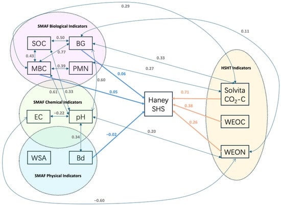 Pathway analysis of Soil Management Assessment Framework (SMAF) and Haney Soil Health Tool (HSHT) indicators. Indicators were selected based on (in)direct significance from the Pearson correlation matrix at p < 0.05. Values above the arrowed lines are standardized pathway coefficients that were used to compare the effect size-independent variables have on the Haney SHS and variables that directly affect the Haney SHS. Bd = bulk density, WSA = water-stable aggregates, EC = electrical conductivity, MBC = microbial biomass carbon, PMN = potentially mineralizable nitrogen, SOC = soil organic carbon, BG = β-glucosidase activity, Solvita CO2-C = Solvita 24 h CO2-C burst, WEOC = water-extractable organic carbon, WEON = water-extractable organic nitrogen, Haney SHS = Haney Soil Health Score.