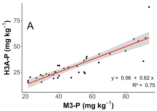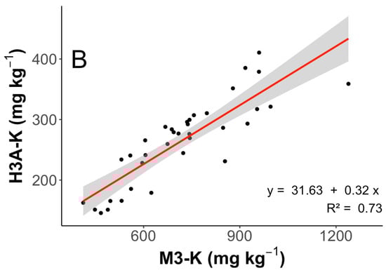 To understand the relationship between SH extractants used for P and K, comparisons between P and K concentrations from SMAF (Mehlich-3 only for this discussion; C-south and C-north sites were excluded) and HSHT (H3A) are shown in Figure 3. The SMAF- and H3A-extractable P and K were correlated (R2 = 0.75 and 0.73, respectively). However, the H3A-extractable P and K were, on average, 37% and 63% lower than the M3-extractable P and K, respectively. This makes sense, as the H3A extractant was designed to mimic root exudates, theoretically extracting biologically available nutrients that plants might encounter [23]. Furthermore, the H3A extractant is not as harsh as a chemical extractant as Mehlich-3. A poor to a complete lack of correlation between H3A and single- or multi-element extractants (e.g., Mehlich-1 and Mehlich-3) have been previously reported [31,77,78].