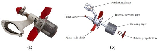 In this study, a modified atomizer was designed based on the structure of the AU5000 atomizer (produced by Micronair) []. The modified atomizer is capable of bearing a flow rate that spans 0~23 L·min−1, and it weighs 1.8 kg in total. The atomizer consists of six mechanisms: an installation clamp, inlet valve, adjustable fan blades (adjustment range 25~85°) [], rotating cage bottom, rotating cage, and internal network pipe. The rotary cage connects the entire atomizer through screws, with threaded holes provided at its rear part for connection to the bottom plate of the rotary cage, and the rotary cage bottom can ensure that the rotary cage does not deform during high-speed rotation. The rotary cage, installed outside and rotating coaxially with the internal network pipe, enables the liquid to undergo secondary atomization, while the internal network pipe is for primary atomization []. The inlet valve is used to connect external pipelines and allow liquid to enter the atomizer. The atomizer can adjust the rotation speed by changing the angle of the fan blades. The rotation speed ranges from 0 to 10,000 r·min−1. The installation clamp serves to firmly fix the atomizer onto the spray boom or rack. Figure 1 presents a photograph and a structural schematic of the atomizer.