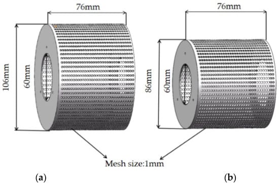 In order to analyze the influence of cage diameter on atomization characteristics and establish a model, this study was based on the original cage diameter of the AU5000 atomizer. Four other cages with different diameters at a gradient of 10 mm were designed. The other structural parameters of the designed rotary cages with different diameters should be kept consistent with those of the original rotary cage, namely, the inner diameter is 60 mm, the mesh size of the cage is 1 mm, and the height of the cage is 76 mm. A schematic diagram of the parameters of rotating cages with different diameters is shown in Figure 2.