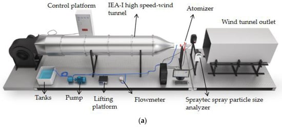 The atomizer is fixed at a position 0.2 m away from the center of the wind tunnel outlet, and the distance between the atomizer and the front end of the spray particle size analyzer is 0.5 m. The temperature is controlled between 20 °C and 22 °C, and the humidity is maintained between 50% and 70% [].