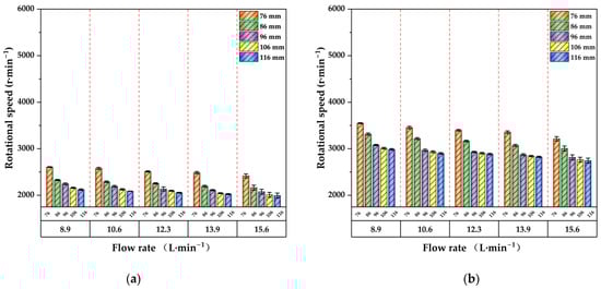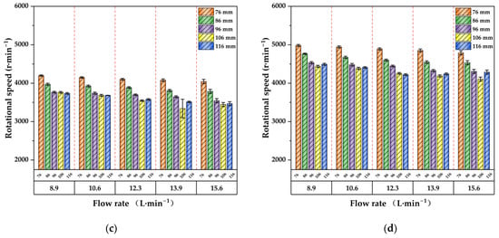 The tachometer measurement results for rotational speed are presented in Figure 4. The rotational speed varies in the range of 1944~4983 r·min−1. At the same flow rate and cage diameter, the rotational speed increases with the increase in wind speed; for example, under the conditions of a cage diameter of 86 mm and a flow rate of 8.9 L·min−1, when the wind speed increases from 41.6 to 50 m/s, the rotational speed increases from 2329 to 3316 r·min−1, with an increase of 42.3%. When the wind speed increases from 50 to 58.3 m/s, the rotational speed increases from 3316 to 3972 r·min−1, with an increase of 19.7%. This indicates that as the wind speed continues to increase, the increase in rotational speed tends to be flattened. Under the same wind speed and flow rate, the rotational speed decreases as the cage diameter increases; however, there are exceptions, as shown in Figure 4d. Under the conditions of wind speed of 66.6 m/s and flow rate of 10.6 L·min−1, when the cage diameter increases from 106 mm to 116 mm, the rotational speed increases from 4386 to 4409 r·min−1. Similarly, under the same wind speed and cage diameter, as the flow rate increases, the rotational speed gradually shows a decreasing trend.