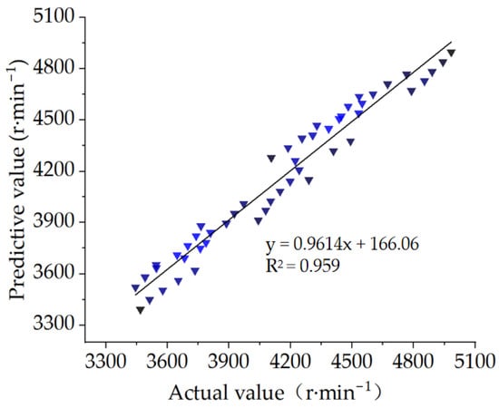 Considering the possible overfitting risk, this study adopted two methods, namely, the comparison between predicted values and measured values and 10-fold cross-validation, to evaluate and judge whether overfitting occurred. Specifically, 50 sets of rotational speed data were used to compare and analyze the predicted values and measured values of rotational speed (Figure 5). The results indicated that the slope of the fitted straight line between the predicted and actual values was close to 1, with an R² of 0.959 for the fitted curve, and the maximum deviation between the predicted and actual values was 4.2%, with no outliers, suggesting a good fitting effect. The 10-fold cross-validation results showed that the average mean squared error (MSE) of the rotational speed prediction model was 8335.07. Together, the 50-group data validation (R2 = 0.959) and 10-fold cross-validation (average MSE of 8335.07) demonstrated that the rotational speed prediction model had good generalization ability and no serious overfitting phenomenon.