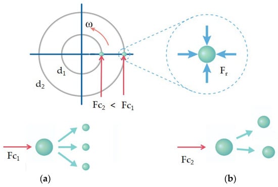 Schematic diagram of the influence of different cage diameters on droplet size. (a) shows a larger centrifugal force (Fc1 corresponds to small droplet size and a large number of droplets); (b) shows a smaller centrifugal force (Fc2 corresponds to larger droplet size and fewer droplets).