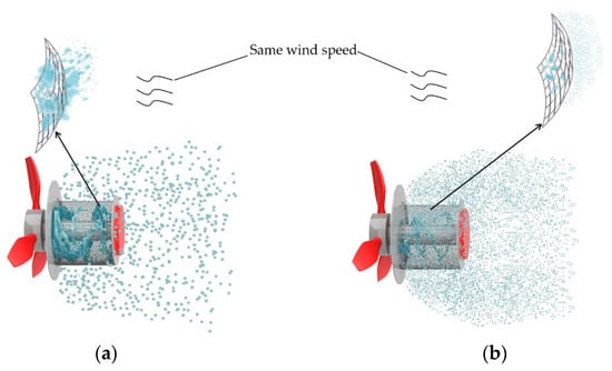 Schematic diagram of the effect of different flow rates on atomizer spray at the same wind speed and cage diameter. (a) High flow rate; (b) low flow rate.