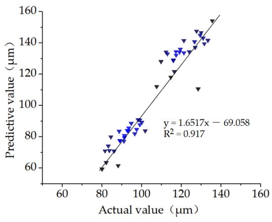 Similarly, the comparison between the predicted values and the measured values and the 10-fold cross-validation method were both adopted to evaluate whether the model was overfitted. The ridge regression model was verified by the measured data from 50 sets of rotating cage spray experiments. A comparative analysis was conducted on the predicted values and the actual values of the droplet size. The slope was relatively small, the R² of the fitted curve was 0.917, and there were no outliers, showing a good agreement. The results are shown in Figure 8. This indicates that the ridge regression model for the droplet size of the rotating cage atomizer is feasible. The evaluation was carried out using the 10-fold cross-validation method, and the results showed that the average mean squared error (MSE) of the droplet size prediction model was 133.7. This indicates that the prediction error of the model for unknown data is approximately 11.56 μm (the square root of the MSE). Both methods indicate that the droplet size prediction model has good generalization ability and there is no serious overfitting phenomenon.