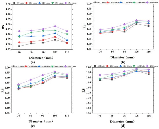 Comparing Figure 9a–d, which show the influence of wind speed on RS, we can see that at a wind speed of 41.6 m/s, the RSs corresponding to different flow rates are relatively scattered. Under the other three wind speeds, the RSs corresponding to different flow rates are relatively concentrated. Moreover, under the same cage diameter and the same flow rate, as the wind speed increases, RS shows an upward trend. The reasons considered are as follows: At lower wind speeds, the air shear force on the droplets is relatively small, so the droplets remain relatively intact and are more evenly distributed. However, at higher wind speeds, the air shear force on the droplets increases significantly and some small droplets combine to form larger ones, thus affecting the RS. Compared with the results of this research on pressure nozzles, this research indicates that as the wind speed increases, the RS increases. Ref. [], which is consistent with the conclusion of this study. In addition, high wind speeds can accelerate the evaporation of droplets [], especially small-size droplets, which are more likely to evaporate rapidly, thus further increasing the RS.