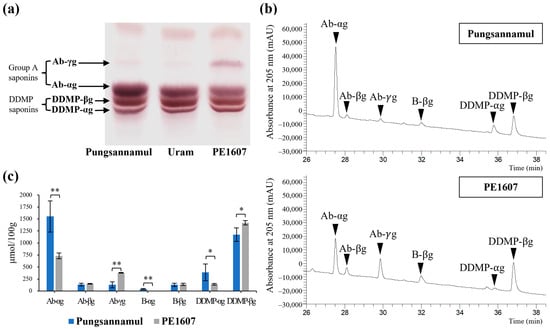 Saponin phenotypes of wild-type and mutant soybean lines in seed hypocotyls. (a) Thin-layer chromatography (TLC) analysis of seed hypocotyls from wild-type cultivars (Pungsannamul and Uram) and the mutant line (PE1607). (b) Liquid chromatography with photodiode array and tandem mass spectrometry (LC-PDA-MS/MS) profiles of saponin extracts from seed hypocotyls of Pungsannamul (upper panel) and PE1607 (lower panel). Saponins are indicated by an upside-down black triangle. (c) Quantification of saponins in seed hypocotyls using LC-PDA-MS/MS. Asterisks indicate significant differences regarding each saponin compound between Pungsannamul and PE1607 using Student’s t-test (* p < 0.05, ** p < 0.01). Error bars represent ± standard deviation of three biological replicates.