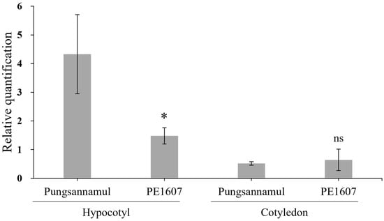 Expression profiles of the Sg-3 gene in hypocotyls and cotyledons of developing seeds. Expression levels were calculated relative to the constitutively expressed gene (Cons7) used as the reference. Error bars represent ± standard deviation of three biological replicates. Asterisks indicate significant differences between Pungsannamul and PE1607 using Student’s t-test (* p < 0.05, ns; not significant).