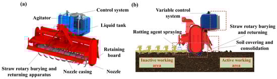 The rice straw rotting and returning machine. (a) Machine structure; (b) working principle.