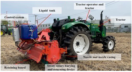The rice straw rotting and returning machine used in this study is a new, self-developed device specifically designed to meet the agronomic requirements and cold rice planting conditions of the northeast region. Its primary function is to perform rice straw rotary burying operations, which include rotary plowing, tilling, and burying of rice straw, as well as the application of a decomposition agent, mulching, and soil leveling. The machine is composed of several key components: a frame, a straw rotary burying and returning apparatus, a straw decomposition agent spraying mechanism, a variable spraying control system, and additional auxiliary components (Figure 2a). The straw rotary burying and returning apparatus, situated at the rear of the apparatus, is responsible for cutting, lifting, and burying the straw, thereby facilitating effective mixing of the straw and soil. The decomposition agent spraying device, comprising the liquid tank, nozzle, and ancillary components, enables the dispensing of the decomposition agent onto the surface of the straw, thereby accelerating the decomposition process. The decomposition of straw is facilitated by matching the decomposition agent to the specific characteristics of the straw in the cold paddy field. The variable spraying control system comprises a liquid pump, a filter, and a controller, among other components. This system can mitigate the potential issues associated with manual control, such as leakage and re-spraying, which can lead to suboptimal spraying effectiveness and reduced liquid utilization. This results in improved spraying efficiency and better liquid usage, while also enhancing the stability of the spraying system.