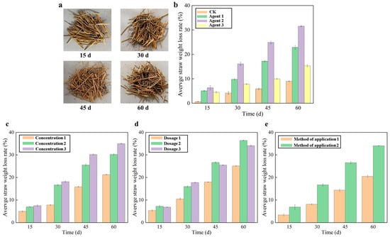 Results of one-factor test for decomposition agent selection. (a) Decomposition of straw over time; (b) effect of decomposition agent type on straw weight loss rate; (c) effect of decomposition agent concentration on straw weight loss rate; (d) effect of decomposition agent application rate on straw weight loss rate; (e) effect of decomposition agent application method on straw weight loss rate.