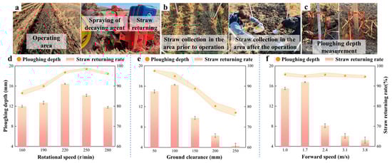 Field trials were conducted to measure straw return rate, plow depth, and other effects (Figure 6). As the knife roller rotational speed increased, the straw return rate initially rose but declined after reaching a peak at 220 r/min. Plow depth increased with rotational speed but stabilized between 220 and 280 r/min (Figure 6d). Ground clearance also influenced straw return, with the highest rate observed at 100 mm, while plow depth decreased with increasing clearance (Figure 6e). Forward speed had a minor impact on plow depth, but the straw return rate peaked at 1.7 m/s and declined significantly at higher speeds (Figure 6f). Based on these findings, the optimal operational parameters were identified as the following: knife roller speed of 220 r/min, ground clearance of 100 mm, and forward speed of 1.7 m/s.