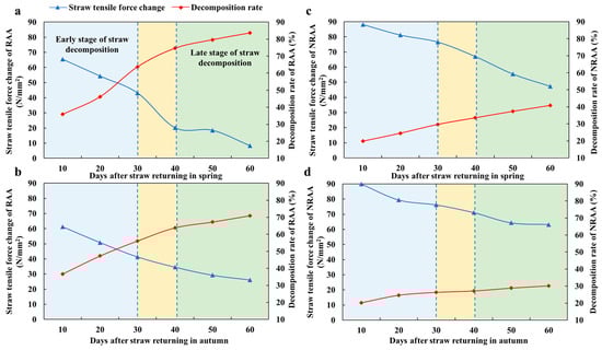Straw decomposition rate and tensile force changes over time for different treatments: (a) spring RAA treatment; (b) autumn RAA treatment; (c) spring NRAA treatment; (d) autumn NRAA treatment. The yellow area in the figure represents the mid-stage of straw decomposition.