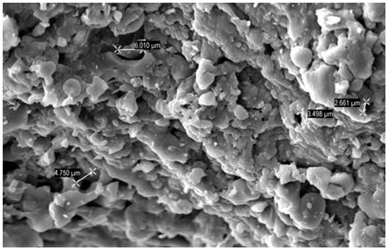 Biochar, with its extensive surface area and porosity, can improve water retention capacity and nutrient uptake in soils [72]. This material has the potential to remove contaminants not only from water and soil but also from gases [73]. Table 2 shows the average specific surface area of the WSB sample. The biochar produced in this study has a high specific surface area value, making it suitable for contaminant removal. Several studies have reported notable BET specific surface area values for biochar derived from various biomass sources, such as short-rotation wood [74,75]. Furthermore, Onal et al. [76] found even higher values for biochar derived from potato peel waste, while Batista et al. [77] observed a temporal increase in surface area when biochar is mixed with soil, as pore water leaches minerals with low affinity for the biochar surface. Therefore, the empty pores of biochar can be filled with organic matter, including humic components, depending on the specific surface area value. This makes biochar a versatile option for the removal of organic substances from water and soil [75,78]. In addition, the highly heterogeneous surface of WSB was observed in the SEM image (see Figure 4), and pore sizes were around 2.6 and 6 µm.