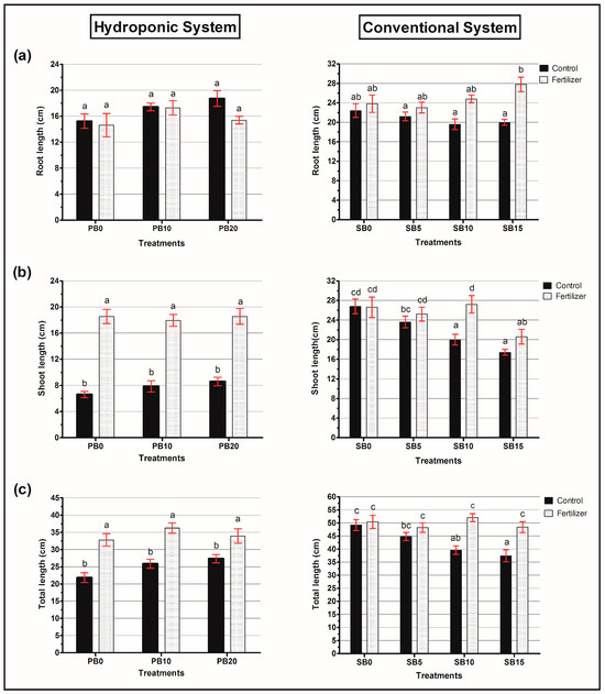 Graphs of the length of lettuce plants growing in hydroponic and conventional systems: (a) Root length, (b) Shoot length, and (c) Total length. Data are means ± SE. Different letters indicate significant differences between treatments (Duncan’s test, p < 0.05).
