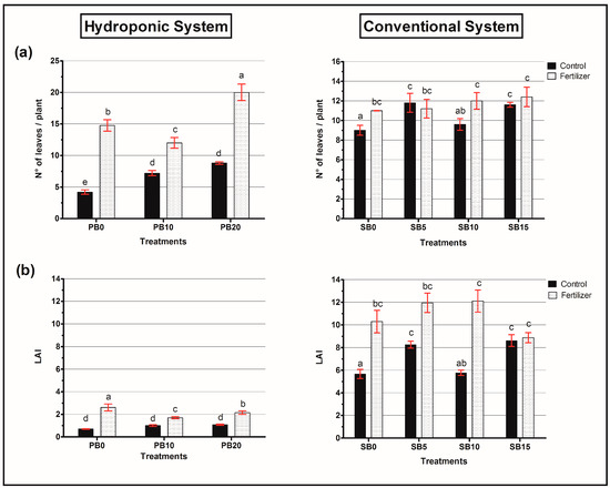Graphs of leaf traits of lettuce plants growing in hydroponic and conventional systems: (a) Number of leaves/plant and (b) Leaf area index (LAI). Bars represent standard deviation. Data are means ± SD. Different letters indicate significant differences between treatments (Duncan’s test, p < 0.05).