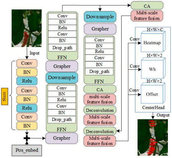 Therefore, this paper proposes a tomato detection method based on Graph-CenterNet for complex scenarios where tomato fruits are occluded and overlapping. This method improves the CenterNet [20] detection model. Since the Visual Graph Convolutional Neural Network [21,22] can utilize the dense morphology of tomatoes in the image and solve the problem of feature confusion caused by vegetation occlusion in the form of an unordered node set, it is combined with the Visual Graph Convolutional Neural Network to enhance feature extraction [23], and the downsampling layers are also reduced. During the deconvolution [24] operation, multi-scale features [25] are fused to enhance the information capture ability. Moreover, because CA [26] introduces a correlation calculation and weight assignment mechanism to strengthen key features, the CA module is added. Experiments were conducted on tomato image data in complex scenarios, and the results show that this method can effectively improve the detection accuracy.