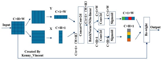 After obtaining the feature maps in the width and height directions, respectively, the feature maps in the two directions are concatenated and fed into a convolutional module with a shared convolutional kernel of 1 × 1. The dimension of the feature maps is reduced to C/r of the original. Then, the feature maps that have undergone batch normalization processing are fed into the Sigmoid activation function, and the attention weights of the feature maps in the width and height directions are obtained. The structure of the CA module is presented in Figure 4.