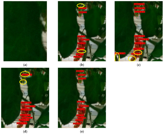 Detection effect of the Tomato Detection Dataset. (a) Original drawing; (b) CenterNet; (c) Faster R-CNN; (d) YOLOv8; and (e) Graph-CenterNet.
