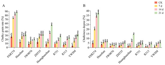 Chalky grain rate (A) and chalkiness degree (B) of different rice varieties under different durations of high temperature during grain filling stage. CK, rice varieties grown under optimum temperature. Data are shown as mean ± standard error of triplicate measurements. Different letters are marked above the standard deviation to express significant differences (p < 0.05).