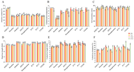 Amylose content (A), gelatinization temperature (B), gel consistency (C), head rice length (D), cooked rice length (E), and cooked rice elongation (F) were analyzed in rice varieties treated with different durations of high temperature during grain filling stage. Data are shown as mean ± standard error of triplicate measurements. Different letters are marked above the standard deviation to express significant differences (p < 0.05).