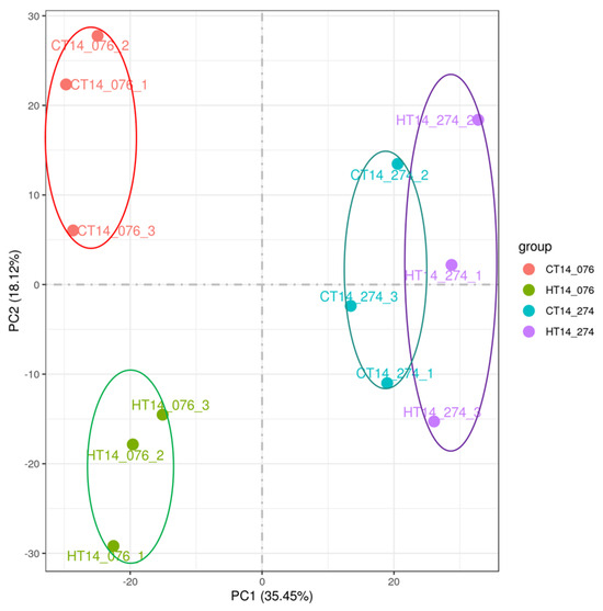 Principal component analysis of 8XR274 and 5W0076 samples. HT14_076_1, HT14_076_2, and HT14_076_3 were 5W0076 samples under high-temperature treatment for 14 days; CT14_076_1, CT14_076_2, and CT14_076_3 were 5W0076 samples under optimum temperature control; HT14_274_1, HT14_274_2, HT14_274_3 were 8XR274 samples under high-temperature treatment for 14 days; CT14_274_1, CT14_274_2, CT14_274_3 were 8XR274 samples under optimum temperature control.