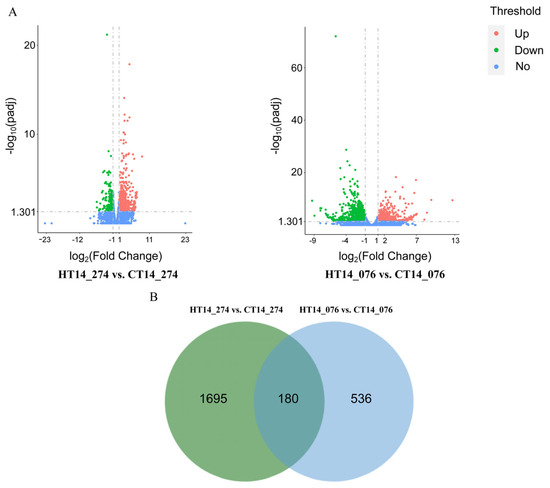 Statistical analysis of DEGs between 8XR274 and 5W0076. (A) The volcano diagram shows the relationship between the fold change of DEGs in 8XR274 (HT14_274 vs. CT14_274) and 5W0076 (HT14_076 vs. CT14_076) and the false discovery rate (FDR). The green dots indicate the down-regulated DEGs, the red dots indicate the up-regulated DEGs, and the blue dots indicate unaltered genes. (B) Venn diagram comparison of 8XR274 and 5W0076 total DEGs.