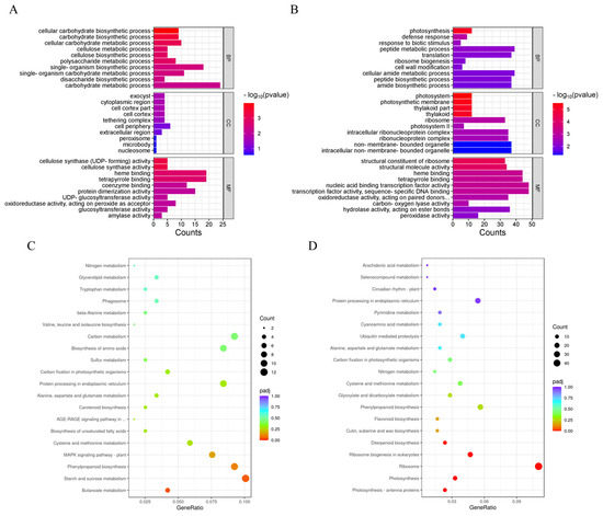 GO enrichment analysis of DEGs in the heat-sensitive variety 8XR274 (A) and heat-tolerant variety 5W0076 (B). The color of the column represents the p value; the smaller the p value, the closer the color is to red. The length of the column reflects the relative number of DEGs associated with each pathway. Enrichment comparison of KEGG pathways in 8XR274 (C) and 5W0076 (D). The point color represents the padj; the smaller the padj, the closer the color is to red. The size of the points reflects the relative number of DEGs associated with each pathway.