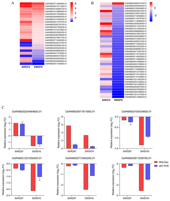 In order to verify the results of RNA-Seq, we randomly selected six genes from these two pathways for qRT-PCR analysis based on the heatmap results. As shown in Figure 6C, the relative trend of the expression profile in qRT-PCR was consistent with the RNA-Seq data (Figure 6C). After high-temperature stress, the expression of OsR498G0204464600.01 was up-regulated in 8XR274, while the opposite was observed in 5W0076; OsR498G0917611900.01 was up-regulated in 8XR274 and 5W0076, with 8XR274 showing a greater up-regulation; in 8XR274 and 5W0076, the expressions of OsR498G0100034600.01, OsR498G1221059300.01, OsR498G0713493200.01, and OsR498G0917206700.01 were down-regulated, with 5W0076 showing a greater degree of down-regulation.
