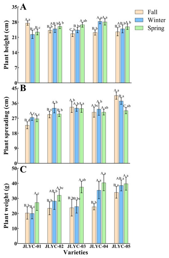 The plant height (A), plant spreading (B), and plant weight (C) of different varieties of leafy Chinese kale cultured in different seasons. Uppercase letters show seasonal differences within varieties, while lowercase letters indicate varietal differences within seasons. Values not sharing a common letter are significantly different at p < 0.05. Error bars stand for ±SD.
