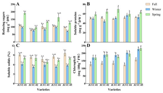 The reducing sugars (A), soluble proteins (B), soluble solids (C), and chlorophyll (D) content in different varieties of leafy Chinese kale cultured in different seasons. Uppercase letters show seasonal differences within varieties, while lowercase letters indicate varietal differences within seasons; comparisons marked solely with lowercase letters were analyzed without simple effects due to non-significant interaction. Values not sharing a common letter are significantly different at p < 0.05. Error bars stand for ±SD.
