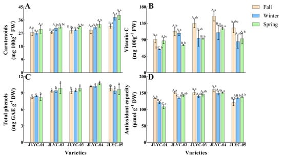 The content of carotenoids (A), vitamin C (B), total phenols (C), and the antioxidant capacity (D) in different varieties of leafy Chinese kale cultured in different seasons. Uppercase letters show seasonal differences within varieties, while lowercase letters indicate varietal differences within seasons; comparisons marked solely with lowercase letters were analyzed without simple effects due to non-significant interaction. Values not sharing a common letter are significantly different at p < 0.05. Error bars stand for ±SD.