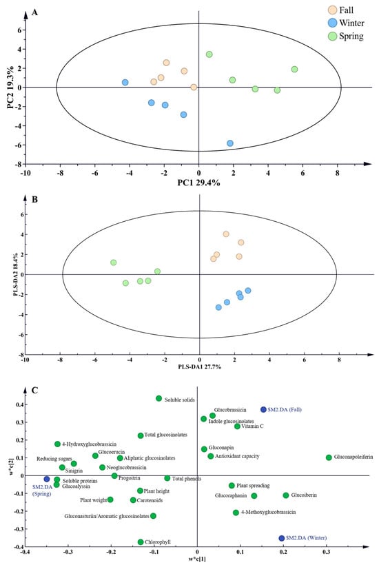 PCA of different cultivation seasons among five varieties of leafy Chinese kale cultured in different seasons. (A) PCA Score plot; (B) PLS-DA Score plot; (C) loading plot. The $M2. DA. is a symbol about a clustering.