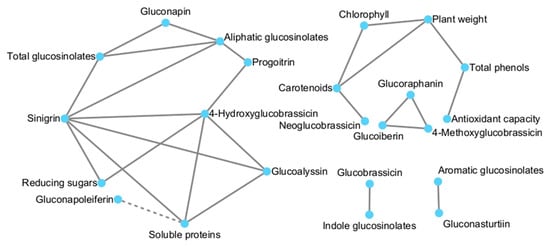Correlation plot of the correlations between nutritional substances and antioxidant capacity in leafy Chinese kale. The dashed lines between indices represent negative correlations, whereas solid lines represent positive correlations (|R2| ≥ 0.65).
