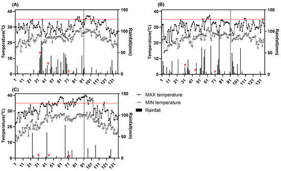 Temperature and rainfall during the entire rice growing season under natural conditions from 2020 to 2022. (A): 2020; (B): 2021; (C): 2022. The X-axis means the number of days after sowing. The vertical lines in the figure indicate the start of rice panicle initiation, the red horizontal line represents 35 °C, and the red triangles represent the time of fertilization.