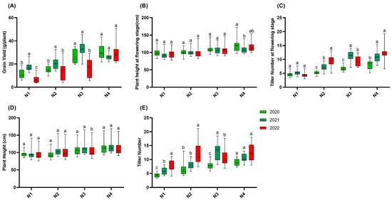 Agronomic traits of 15 rice varieties in 2020, 2021, and 2022. (A): Grain yield; (B): plant height at flowering stage; (C): tiller number at flowering stage; (D): plant height; (E): tiller number. N1: 65 kgN·ha−1, N2: 150 kgN·ha−1, N3: 250 kgN·ha−1, and N4: 350 kgN·ha−1. n = 15 biological replicates; different lowercase letters indicate significant differences (p < 0.05; Duncan’s multiple range test).