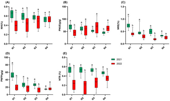 NUE of 15 rice varieties in 2021 and 2022. (A): NHI; (B): PNUE; (C): NRE; (D): PNFP; (E): NTR. N1: 65 kgN·ha−1, N2: 150 kgN·ha−1, N3: 250 kgN·ha−1, and N4: 350 kgN·ha−1. n = 15 biological replicates; different lowercase letters indicate significant differences (p < 0.05; Duncan’s multiple range test).