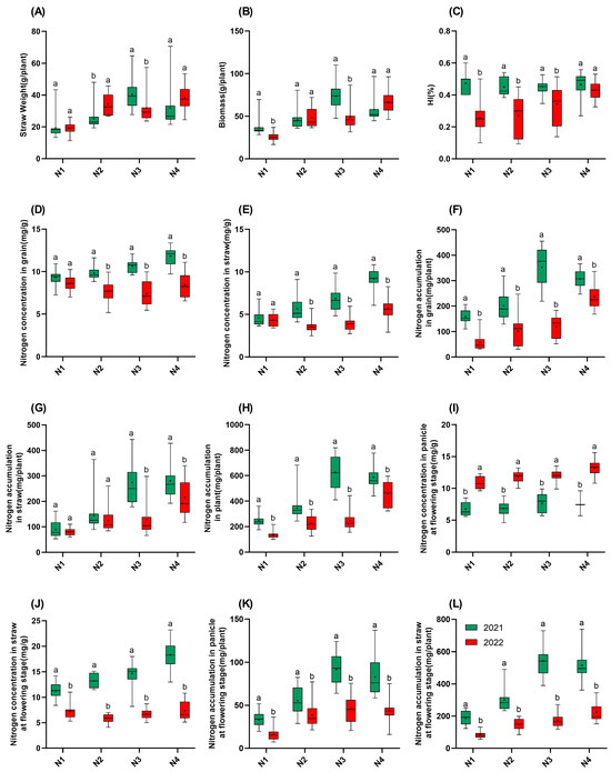 Traits of 15 rice varieties in 2021 and 2022. (A): Straw weight; (B): biomass; (C): HI; (D): nitrogen concentration in grain; (E): nitrogen concentration in straw; (F): nitrogen accumulation in grain; (G): nitrogen accumulation in straw; (H): nitrogen accumulation in plant; (I): nitrogen concentration in panicle at flowering stage; (J): nitrogen concentration in straw at flowering stage; (K): nitrogen accumulation in panicle at flowering stage; (L): nitrogen accumulation in straw at flowering stage. N1: 65 kgN·ha−1, N2: 150 kgN·ha−1, N3: 250 kgN·ha−1, and N4: 350 kgN·ha−1. n = 15 biological replicates; different lowercase letters indicate significant differences (p < 0.05; Duncan’s multiple range test).