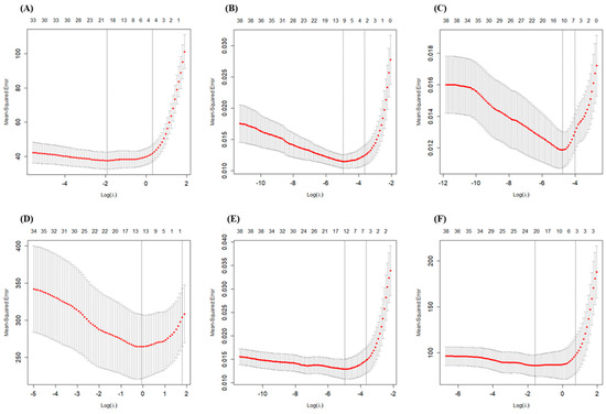 In our study, 10-fold cross-validation was used to select the tuning parameter λ. The mean-squared error was computed based on 10-fold cross-validation. The red dashed line represents the mean-squared error, and the error bars represent the standard deviation of the mean-squared error, as shown in Figure 5 and Figure S1. Two special values along the λ sequence are indicated by the vertical dotted lines. Lambda.min is the λ value that minimizes the mean cross-validation error, while lambda.1se is the value of λ that gives the most regularized model such that the cross validated error is within one standard error of the minimum. All the results in this study are based on the selection of lambda.1se, aiming to identify the independent variables most significantly correlated with the dependent variables.