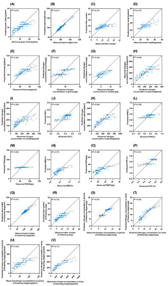 Comparison of measured and LASSO predicted values of different traits. Black solid line represents 1:1 line. Red line represents trend line (A): Grain yield; (B): plant height; (C): tiller number; (D): straw weight; (E): biomass; (F): nitrogen concentration in grain; (G): nitrogen concentration in straw; (H): nitrogen accumulation in grain; (I): nitrogen accumulation in straw; (J): HI; (K): nitrogen accumulation in plant; (L): NHI; (M): PNUE; (N): NRE; (O): PNFP; (P): NTR; (Q): plant height at flowering stage; (R): tiller number at flowering stage; (S): nitrogen concentration in panicle at flowering stage; (T): nitrogen concentration in straw at flowering stage; (U): nitrogen accumulation in panicle at flowering stage; (V): nitrogen accumulation in straw at flowering stage.