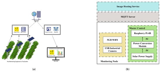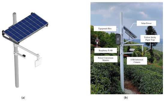 Figure 3b, the tea tree pest monitoring device is installed on a 3-meter-high pole, with a sleeve in the middle of the pole to support the horizontal arm for installation of the monitoring camera and the pest observation steel plate. The high-definition camera is placed 50 cm away from the pest observation board. To enhance the tidiness of the wiring layout and the flexibility of the equipment’s operation, outlets are included at the bottom and sides, as well as universal joints mounted on each horizontal arm. In addition, the device is secured by a solid steel ground cage and a thick flange to ensure stability, ensuring that the device can operate safely and stably, even in adverse weather conditions. All key control devices, including the Raspberry Pi 4B and the power voltage regulation module, are safely enclosed in a stainless-steel distribution box on the pole, achieving good electromagnetic isolation and protection.