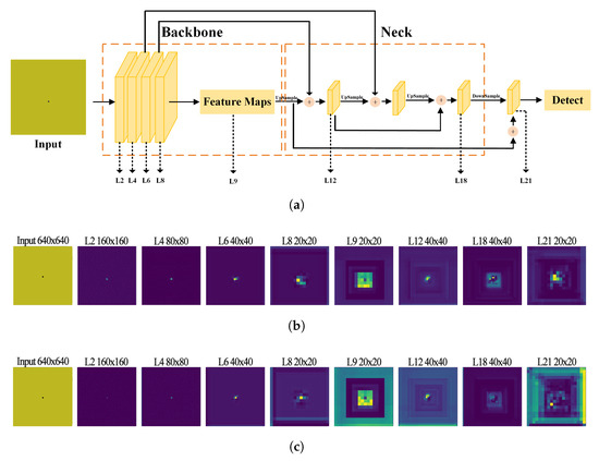 Figure 7b,c, it can be found that during feature extraction in the backbone stage of the neural network, as the number of convolutional neural network layers increases, the size of the feature maps gradually decreases, while their receptive field correspondingly expands. In this experiment, the small target information underwent high-level semantic information extraction in the backbone stage. Although some detailed information was not fully captured, there was no large-scale information loss overall. In light of this finding, we chose to retain the overall structure of the backbone part in our subsequent improvement work, making only a few modifications to ensure that the key feature information of small targets was effectively utilized and properly protected. In contrast, by examining the changes in feature maps during the feature extraction process in the neck part of the neural network, we found that the small target information suffered more severe information loss during the down-sampling process in the PAN-FPN stage. The phenomenon of information deficiency continued to intensify in the subsequent transmission process of the feature maps, ultimately affecting the model’s detection head’s ability to identify and locate small targets.