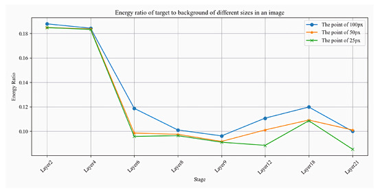 To more accurately evaluate the model’s perceptual ability for target features at different stages, this manuscript introduces a quantitative metric—the energy cluster ratio. This concept aims to measure the changes in the target’s attention in the image through the application a quantitative scientific method. We selected a 55 × 55 pixel area at the center of the feature map, calculated the energy value in that area, and compared it with the energy value of the remaining area of the entire feature map. The process of energy calculation involves summing the image matrix in a specific area, as shown in Equations (