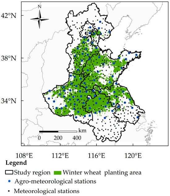 The HHH region is predominantly situated within the mid-latitude zone of China’s eastern monsoon climate region, including Beijing, Tianjin, Hebei, Henan, Shandong, Anhui, and Jiangsu provinces (Figure 1). It lies within the warm temperate semi-humid climatic zone, where the average annual air temperature ranges from 11 to 12 °C in the northern part, and from 14 to 15 °C in the southern part [61,62]. Owing to the temperate monsoon climate characteristic of this region, the annual precipitation is relatively low and exhibits significant spatial and temporal variability. Notably, only about 30 to 40% of the annual precipitation occurs during the winter wheat growing season [63], rendering the region particularly vulnerable to the impacts of climate change [14]. The data regarding winter wheat planting areas in the HHH region is derived from a 1 km phenological dataset that includes three major crops in China from 2000 to 2019 [64].