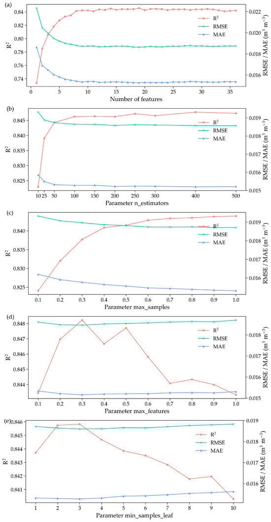 The setting of hyperparameters in the RF regression model significantly influences both the model’s simulation accuracy and its generalization capability. In this study, the critical parameters selected for examination include the number of features derived from the most important features, the number of base estimators in the RF (n_estimators), the number of samples utilized to train each base estimator (max_samples), the number of features considered for the optimal split (max_features), and the minimum number of samples required at a leaf node (min_samples_leaf) [40]. Figure 3 illustrates the fluctuations in the average accuracy evaluation metrics of RF models at different soil depths. These fluctuations were affected by modifications in hyperparameters, as demonstrated by the results of the 10-fold cross-validation. The three model accuracy evaluation metrics depicted in the figure demonstrate a consistent assessment of the model performance. Specifically, Figure 3a indicates that the inclusion of the top 19 most significant features is essential for constructing the RF models to achieve optimal performance. Figure 3b suggests that utilizing 400 base estimators within the RF framework can enhance performance. Figure 3c presents the max_samples parameter expressed as a ratio, which indicates that training each base estimator with the entirety of the samples can yield optimal performance. Similarly, Figure 3d represents the max_features parameter as a ratio, showing that considering 30% of the input features during each split can lead to optimal results. Figure 3e specified that a split point in the tree will only be considered if there are at least three training samples remaining in both the left and right branches. This parameter could contribute to model smoothness in regression contexts.