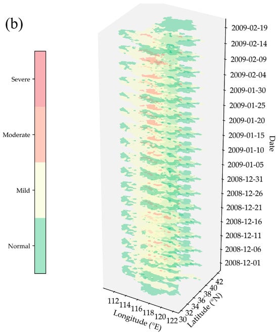 The spatial evolution of drought identified by the machine learning–physical process hybrid drought monitoring system under rain-fed conditions for typical regional drought processes of Huang-Huai-Hai (HHH) region from 1 March to 5 May 2004 (a) and 1 December 2008 to 19 February 2009 (b).