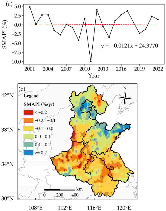 The interannual variation (a) and the spatial distribution of trend (b) of the average value of Soil Moisture Anomaly Percentage Index (SMAPI) derived from the machine learning–physical process hybrid drought monitoring system during the growing season of winter wheat in the Huang-Huai-Hai (HHH) region from 2001 to 2022 under rain-fed conditions. The red dashed line represents the trend line.