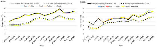 Average daily and night temperatures under photoselective nets in the blueberry orchard during 2022 and 2023 are presented in Figure 3.