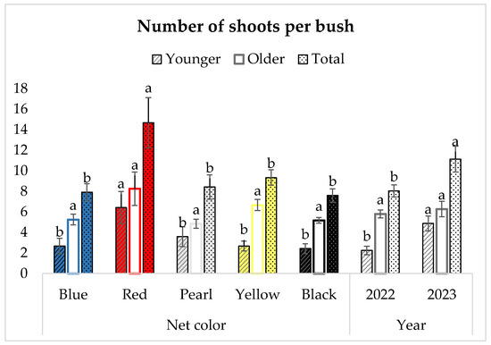 Number of younger, older, and total shoots per bush of blueberry cv. ‘Duke’. Data are the means (n = 3) ± standard error. The same letters assigned for each parameter for the net color and year denote no significant differences according to the LSD test at p ≤ 0.05.